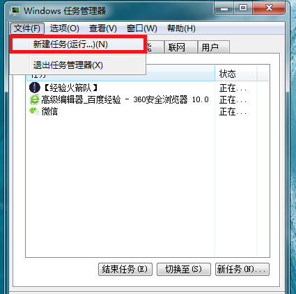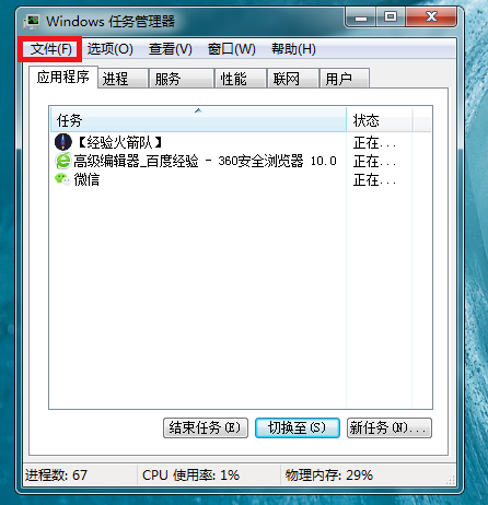 按住快捷键【Alt+Ctrl+Del】,启动Windows任务管理器,如图,在菜单栏中点击【文件】,