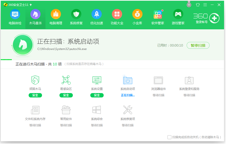 开始扫描检测系统,耐心等待,如果显示有病毒或木马程序,按照提示进行查杀,即可成功解决问题。