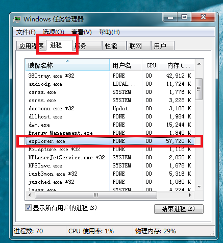 然后点击【进程】选项,仔细查看是否有explorer.exe程序,如果有这个程序,导致桌面无法显示的原因可能是系统中了木马病毒,
