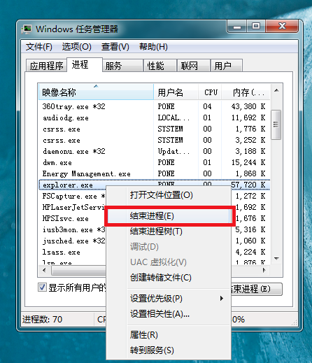 此时选中explorer.exe程序,鼠标右击,弹出菜单,点击【结束进程】选项,