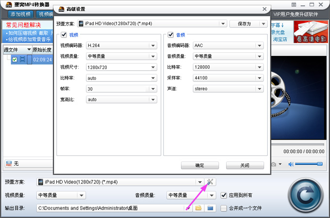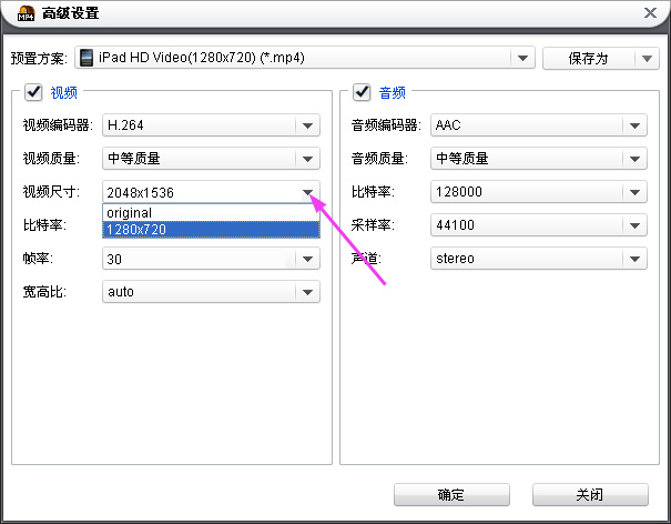 ipad选项中有三个不同分辨率的mp4格式,如果没有你需要的分辨率,可以点击【高级设置】按钮,