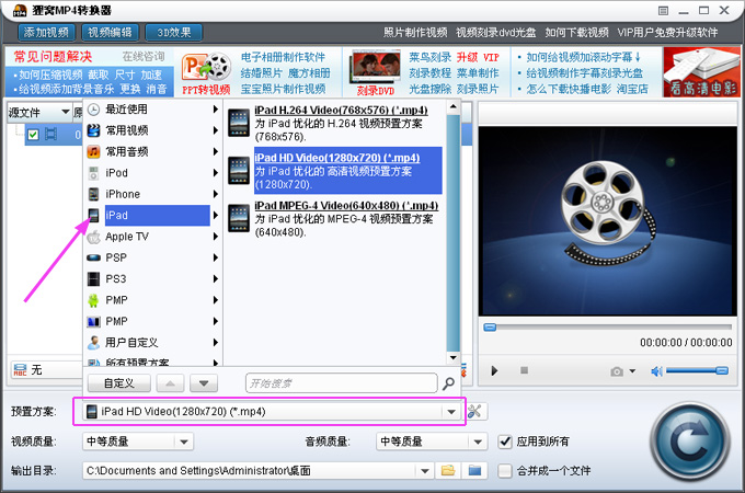 视频导入成功,点击三角按钮,选择视频输出格式,你可以查看关于ipad的格式选项,
