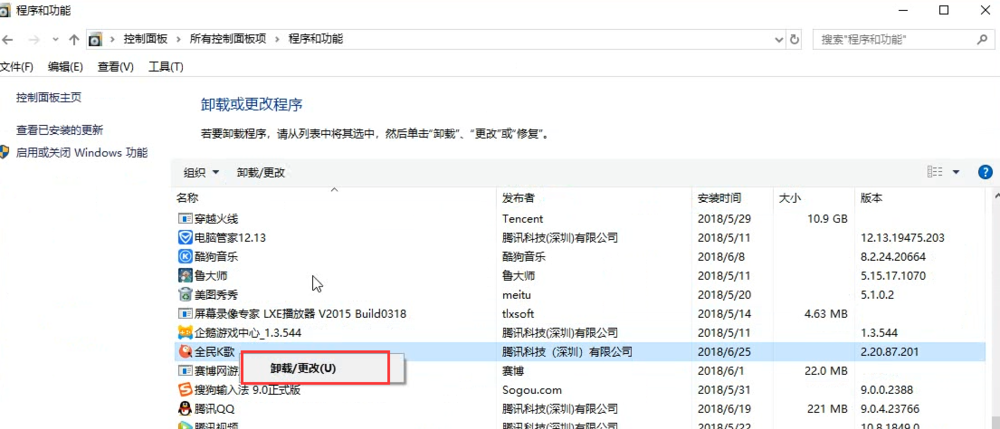 如图,找到全民K歌,鼠标右击,点击【卸载/更改】,重启计算机,然后重新下载安装全民K歌,运行软件,查看问题是否解决了。