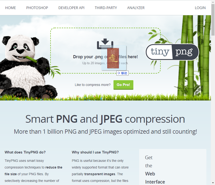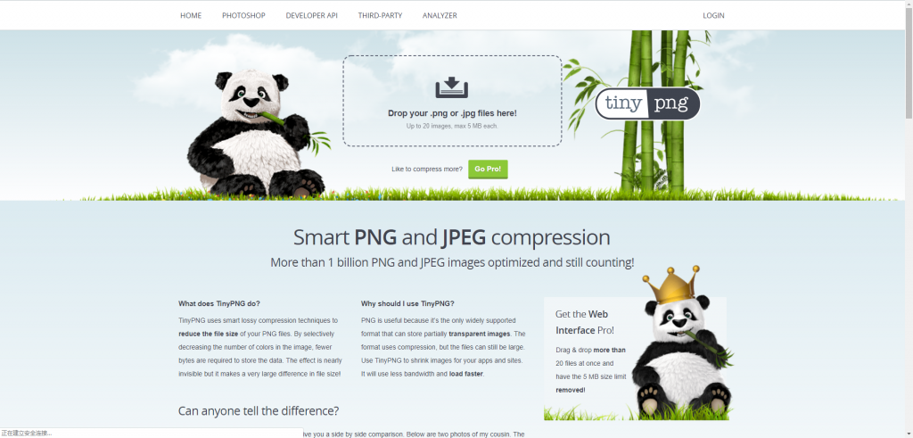 TinyPNG是一个非常受欢迎的图片在线处理平台,相信很多人都不陌生,进入网站,界面如下,