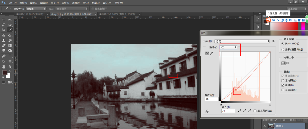 发现建筑物还有些偏红,如图,点击【通道】,选择红,然后按住Ctrl键,单击图中建筑物的房顶去样,发现曲线上有了一个点,为了减少取样点的红色调,向下拉动该点,