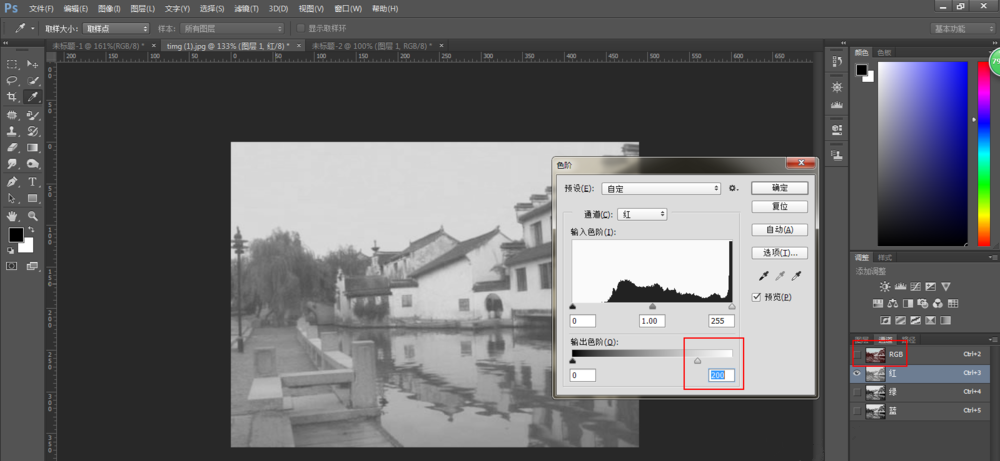 切换红通道,减少红色的输出,按快捷键【Ctrl+L】,弹出色阶窗口,在输出色阶条上向左拉动白色滑块,观察RGB通道已经不太偏红,
