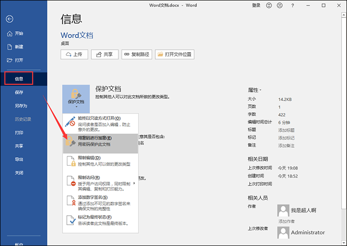 1、打开Word文档,点击【文件】——【信息】,如图,在信息界面中点击【用密码进行加密】,