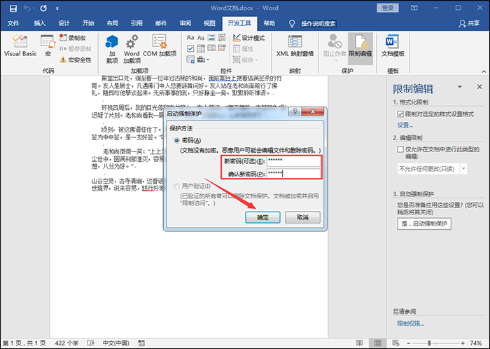 2、弹出加密文档对话框,输入密码,点击确定即可,然后在确认密码界面中再次输入密码,点击确定。
