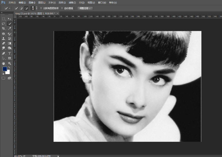 打开Photoshop软件,导入一张黑白色照片,按住快捷键【Ctrl+J】,复制图层,然后使用快速选择工具选中头发,