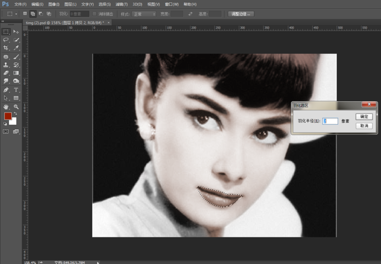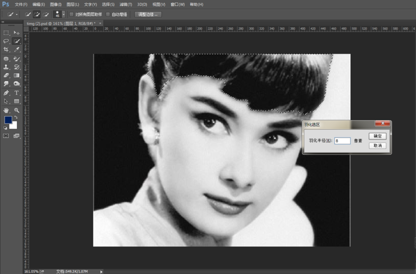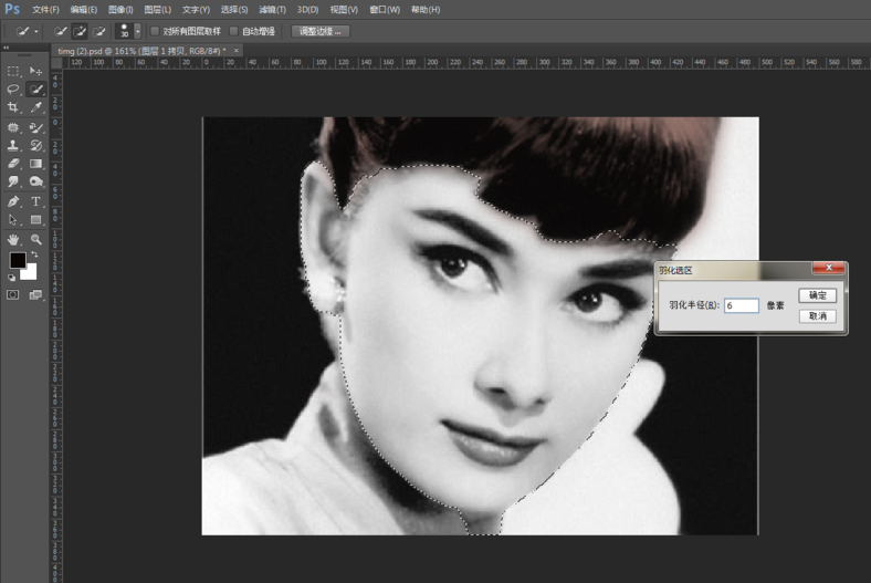 按住快捷键【Shift+F6】,打开羽化选区窗口,设置头发选区的羽化值,如此一来,在对头发上色时可以与皮肤交界处进行柔和过渡,