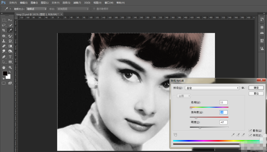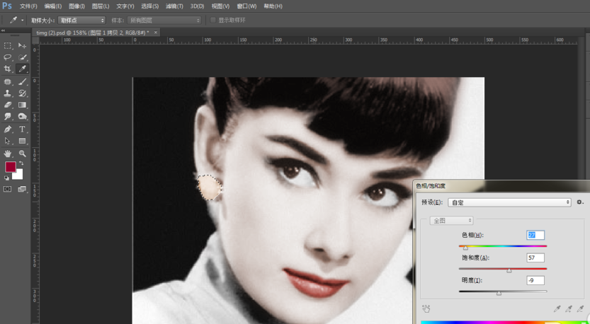 使用快速选择工具选中耳钉,设置羽化值,打开色相/饱和度调整颜色,方法同上,