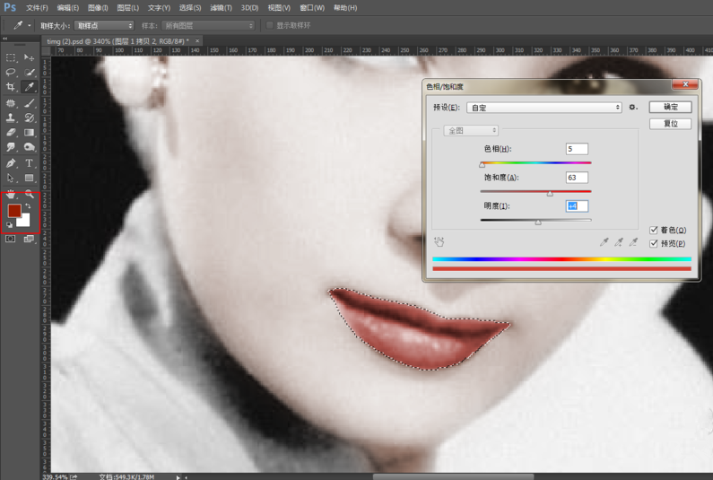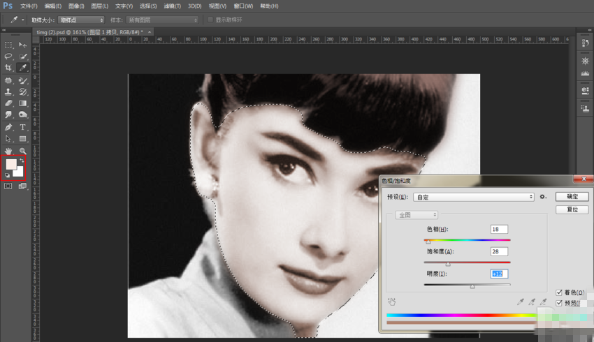 将前景色调整为红色,打开色相/饱和度面板,勾选【着色】,调节饱和度和明度,设置完成,取消勾选,