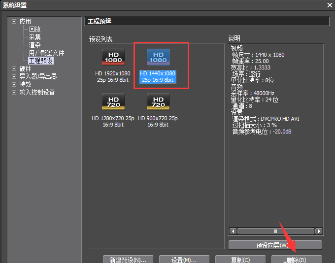 如图,我们可以看到系统默认的四种工程预设,选中不想要的工程预设,点击右下角的【删除】按钮,