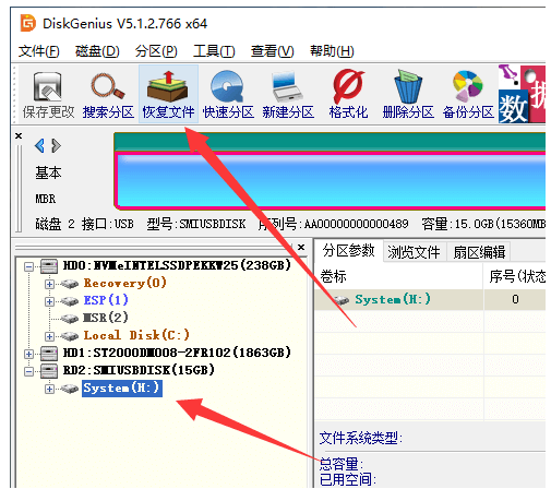先将U盘插入电脑,确定电脑可以正常识别该U盘,然后打开DiskGenius软件,找到并选择目标U盘,点击工具栏上的【恢复文件】按钮,