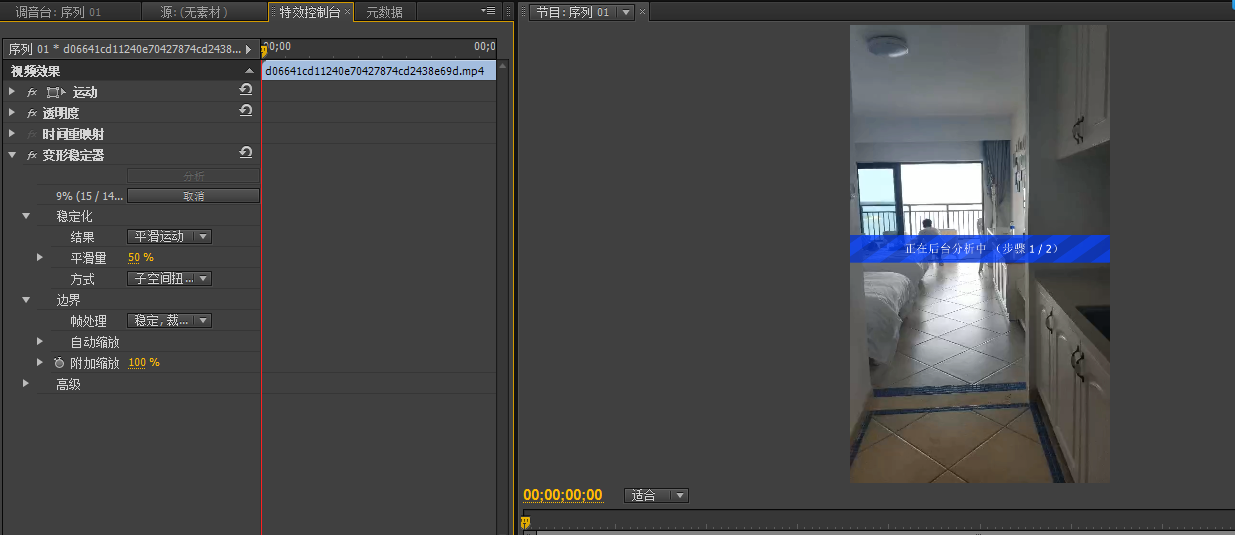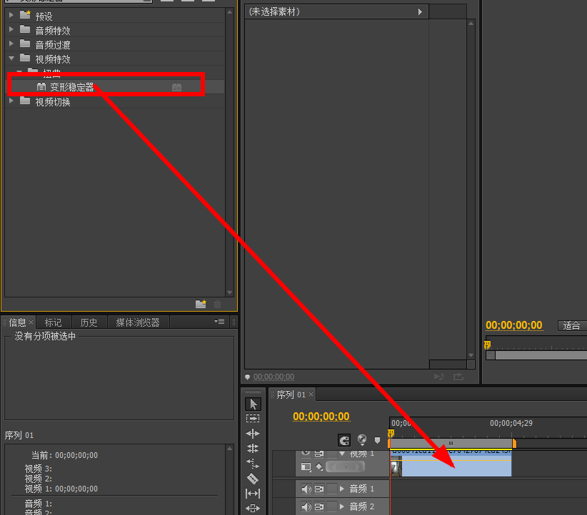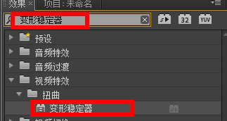 将变形稳定器效果拖入到视频中,