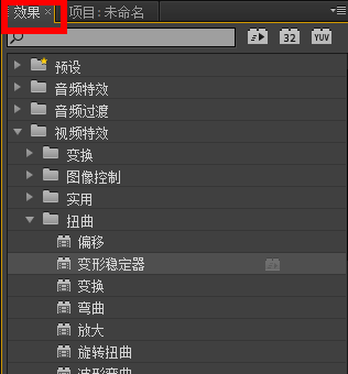 在界面上方点击【效果】,搜索并找到【变形稳定器】或者【wark】,如图,