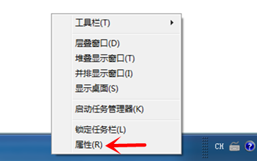 鼠标右击任务栏,弹出菜单,点击【属性】,