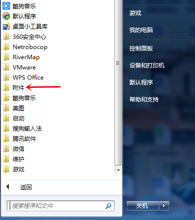 呼出开始菜单,点击【所有程序】选项,然后点击【附件】,