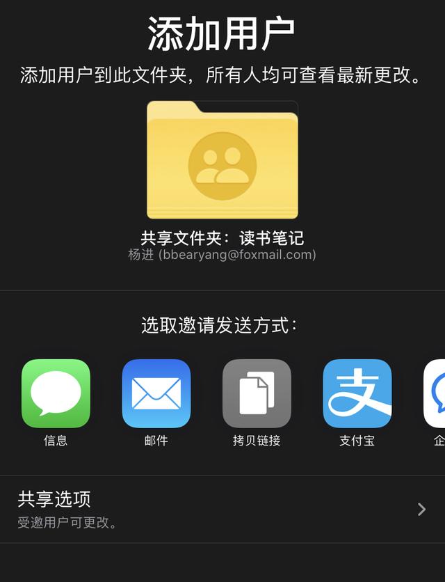 你可以选择通过短信、邮件等方式对备忘录文件夹进行共享;注意,底部有一个【共享选项】,默认受邀用户可以更改备忘录,如果你不想让他人更改内容,可以自行设置,