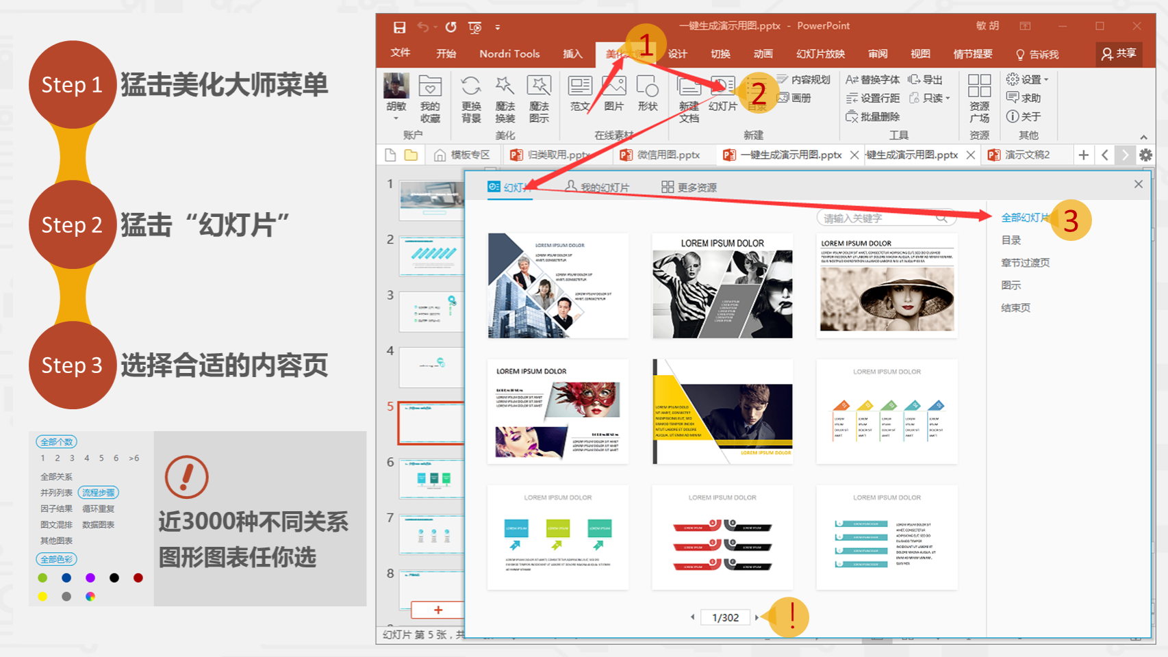 在菜单栏中点击【美化大师】——【幻灯片】选项,就能看到近3000种不同关系的正文图示和图表,能够将幻灯片文字内容进行可视化,
