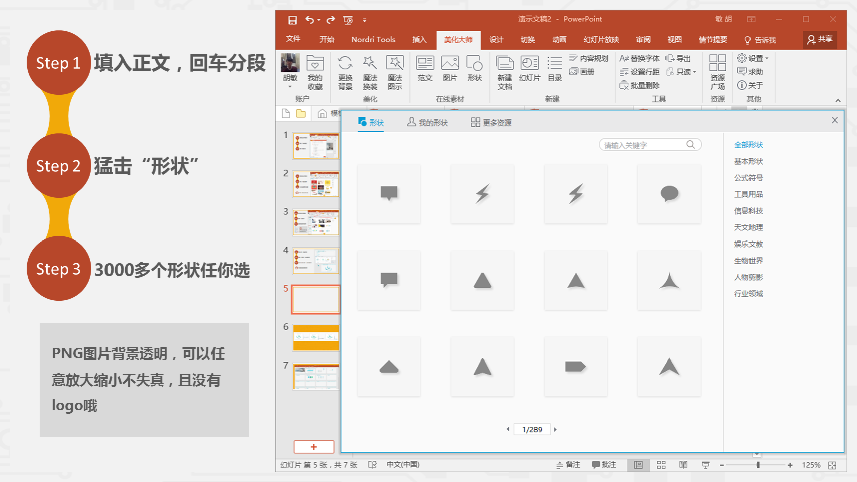 同样,点开【美化大师】——【形状】,可以看到分了9个类别的的矢量icon库,不得不说,素材资源足够齐全!