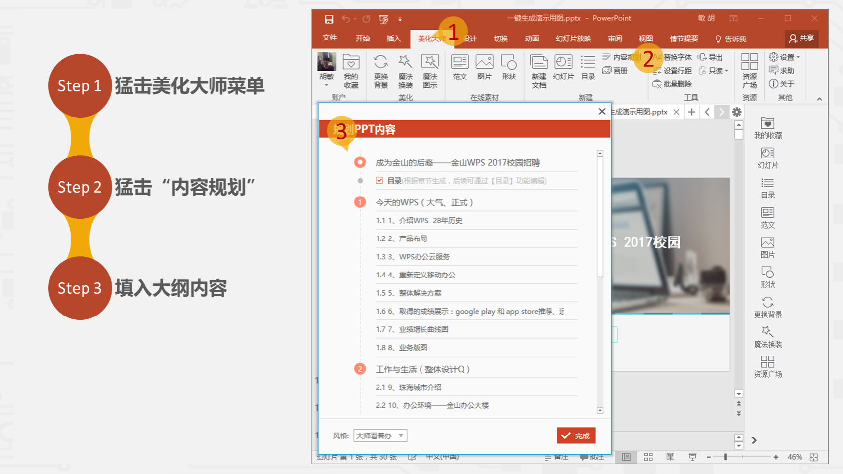 下载安装PPT美化大师,然后新建一个PPT文稿,在菜单栏中点击【美化大师】——【内容规划】,弹出对话框,填入PPT大纲内容,点击【完成】,软件即可自动生成一个风格统一的PPT,
