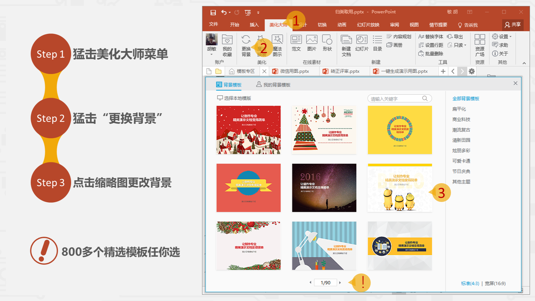 在菜单栏中点击【美化大师】——【更换背景】,你就能免费拥有800多套精美的背景模板,任你挑选,是不是很爽呢?