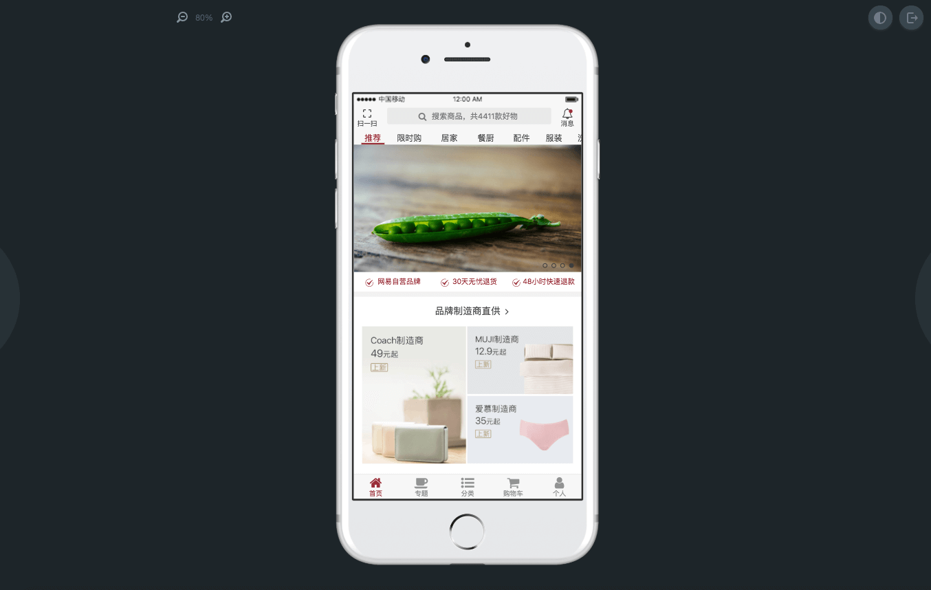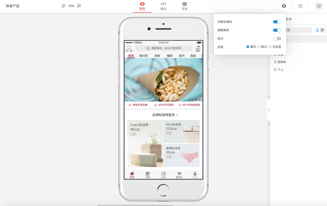 原型制作过程中,你可以随时查看原型在PC或移动设备上的真实运行效果,还可以将原型进行分享。在工作区点击【运行】按钮,即可进入原型演示模式;在【预览】页面,你还可以进行详细设置。例如原型是否带真机外壳、是否显示批注等等,