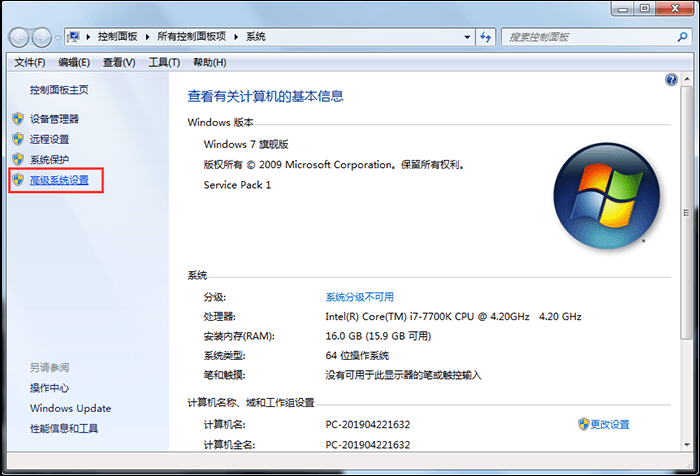 1、鼠标右击【计算机】图标,弹出菜单,选择【属性】,如图,在系统属性界面中点击【高级系统设置】,