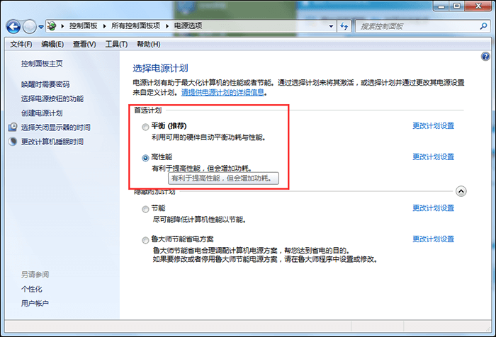 2、进入电源选项界面,如果你的【首选计划】是高性能状态,立即取消;如果不是,则选择【高性能】状态。