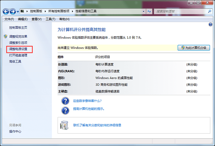 1、打开控制面板,点击【性能信息和工具】,进入如图界面,然后点击【调整电源设置】选项,