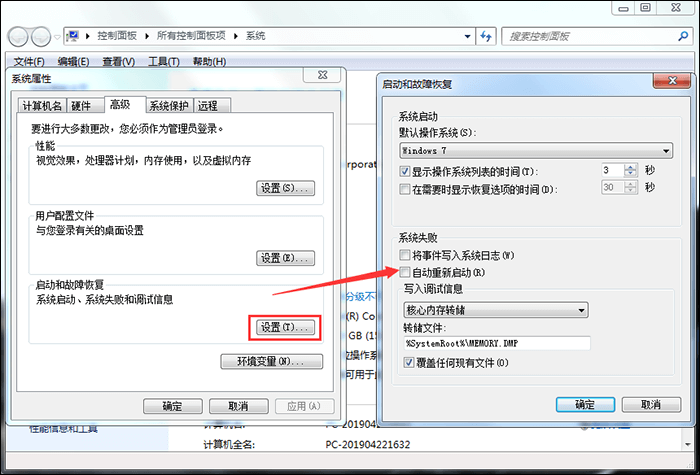 2、打开系统属性窗口,点击【高级】——【启动和故障恢复】——【设置】,进入启动和故障恢复界面,取消勾选【自动重新启动】,点击确定就可以了。