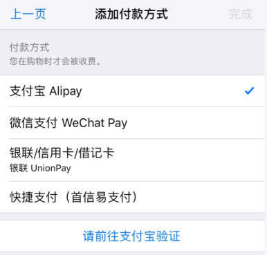 7、添加付款方式,选择支付宝,进行验证即可。