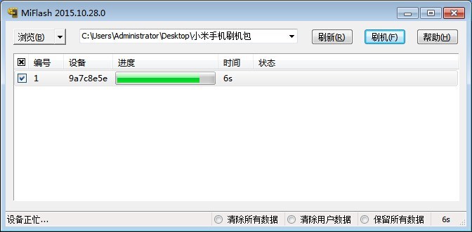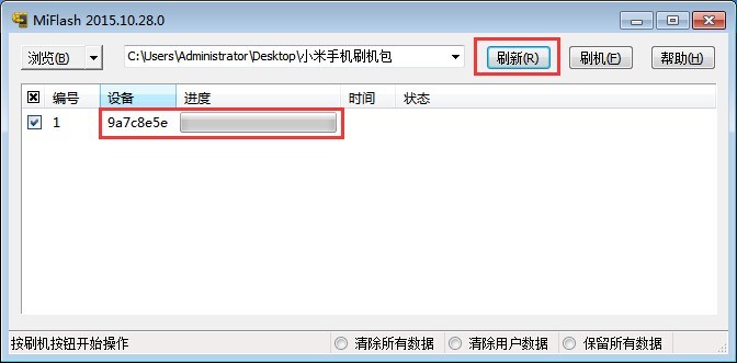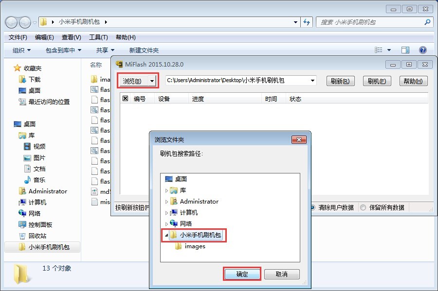 将刷机包解压缩,然后打开MiFlash,点击【浏览】,选择刷机包文件夹,并确定,