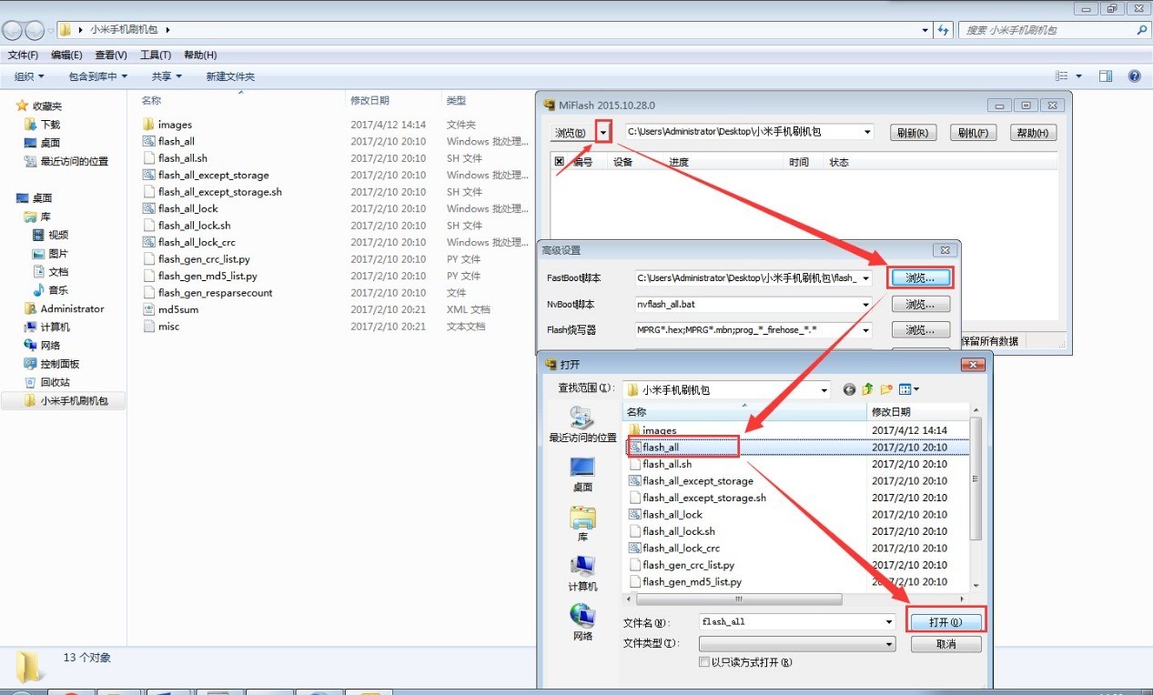 如图,点击【浏览】选项旁边的小箭头,选择【高级设置】,打开高级设置对话框,在fastboot脚本那里选择【浏览】,找到刷机包的目录,找到名字为Flash_all的文件,选中,点击【打开】,