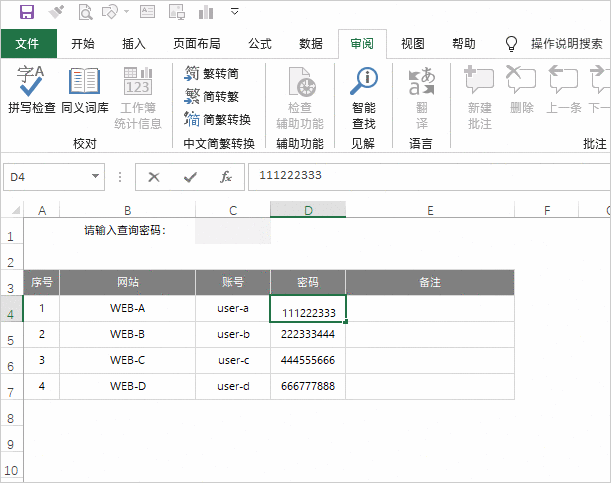 5. 依次修改D5、D6、D7单元格的公式项,将其中的“111222333”分别修改为各自的密码;