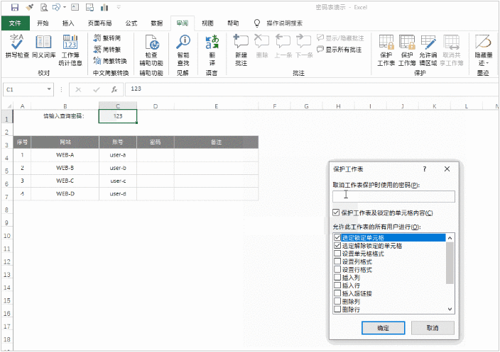 6. 最后也是最重要的一步,右击C1进入“单元格格式”对话框,取消“保护”标签下的“锁定”复选框。然后回到编辑状态,点击“审阅→保护工作表”,取消“选定锁定单元格”前面的复选框,再设置一个修改权限密码即可。这一步主要是防止别人通过查看公式,来绕开我们的密码设置。至此,全部设置完成;