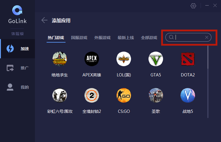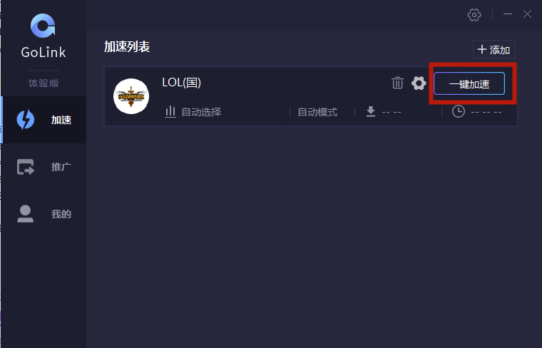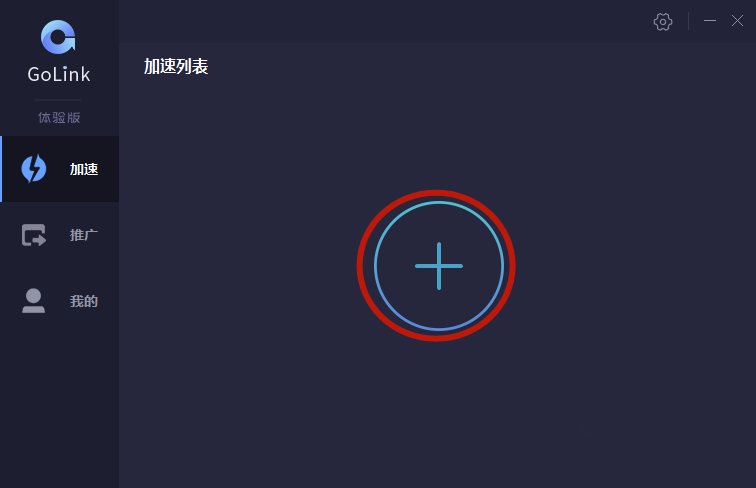 登陆Golink,进入界面,点击左侧的【加速】按钮,即可看到一个加号,点击它,添加应用程序,