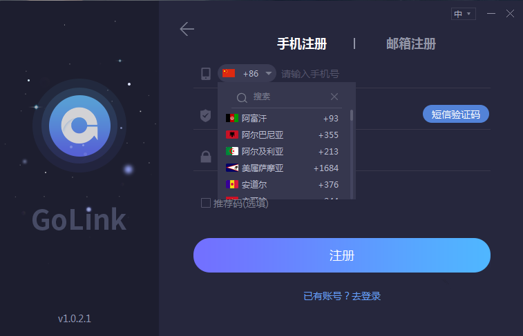 在PC端打开GoLink加速器,注册个人账号,用手机号或者邮箱注册,根据实际情况选择国家,