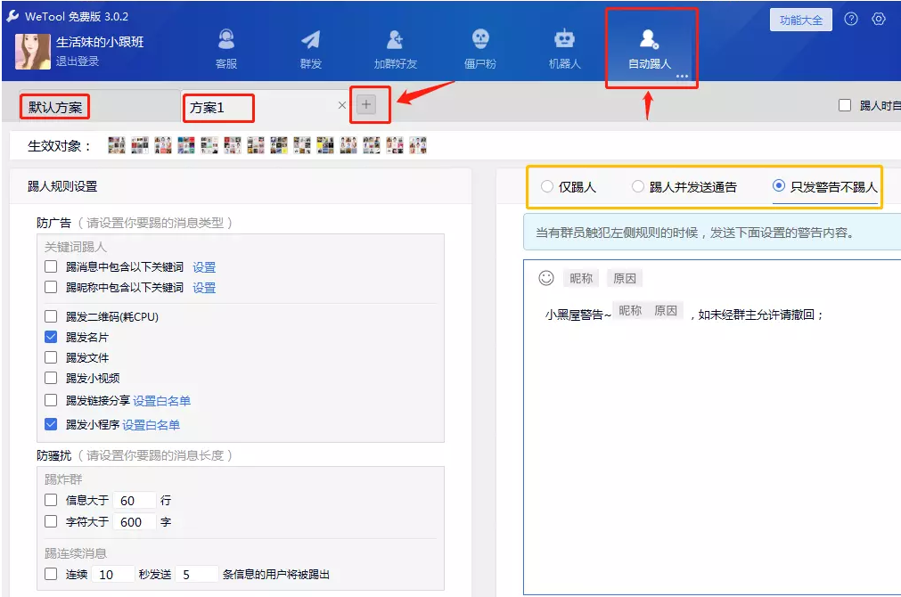 几十个微信群,群规各不相同,你可以设置多个踢人规则,只需要添加方案,分开管理即可。