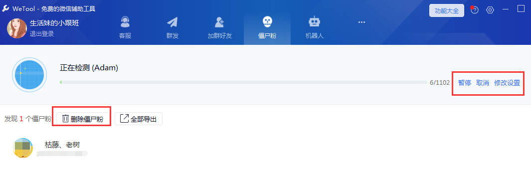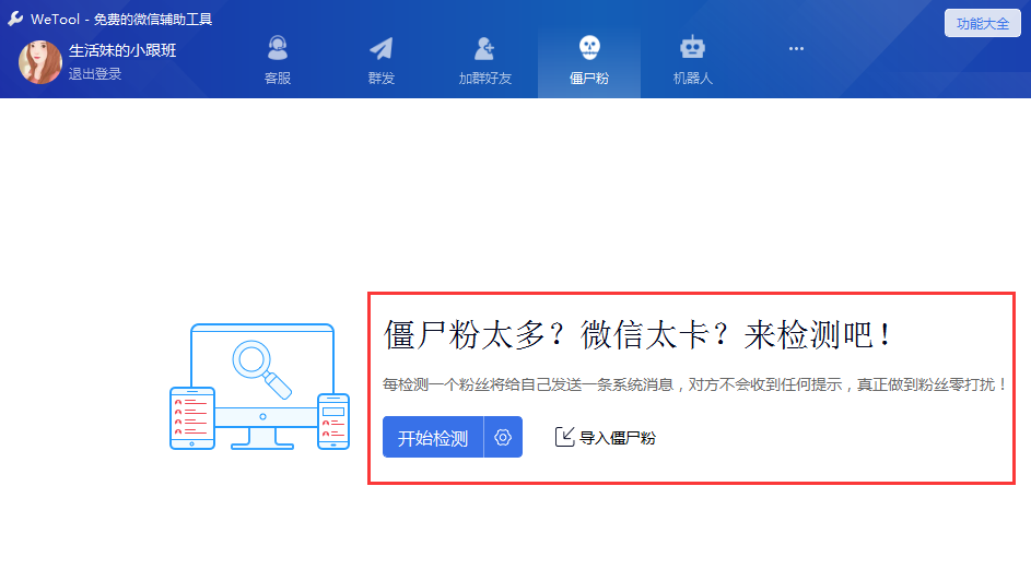 清除僵尸粉,这是所有人都想要的一个功能,以往,有人会去淘宝付费买软件进行检测,真的没必要!!!WeTool可以自动检测僵尸粉,然后进行批量删除,整个过程不会打扰到对方!