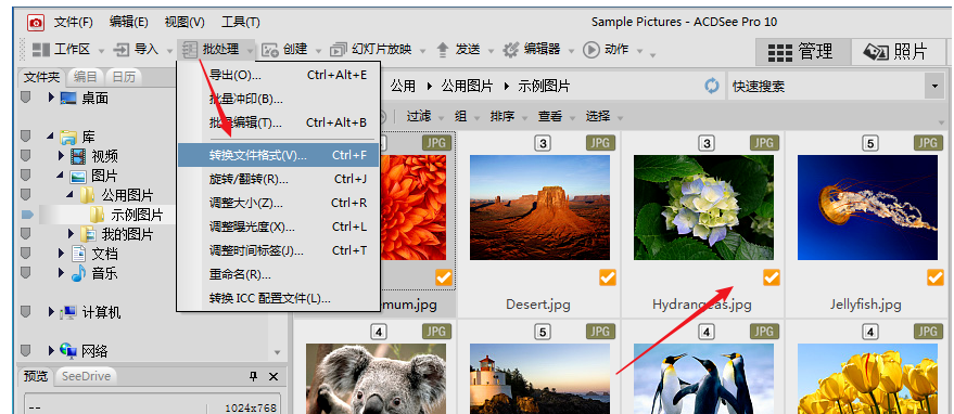 选中需要处理的图片,在上方工具栏中点击【批处理】——【转换文件格式】,如图,