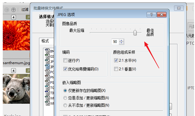 小编选择的是JPEG格式,如图,在选项窗口中设置图像品质,设置越小、压缩率越大,你还可以选择编码、颜色组成采样以及嵌入缩略图等,