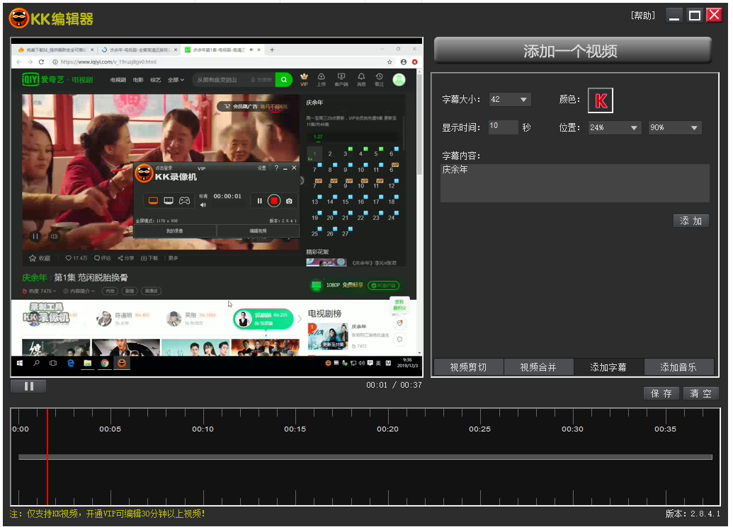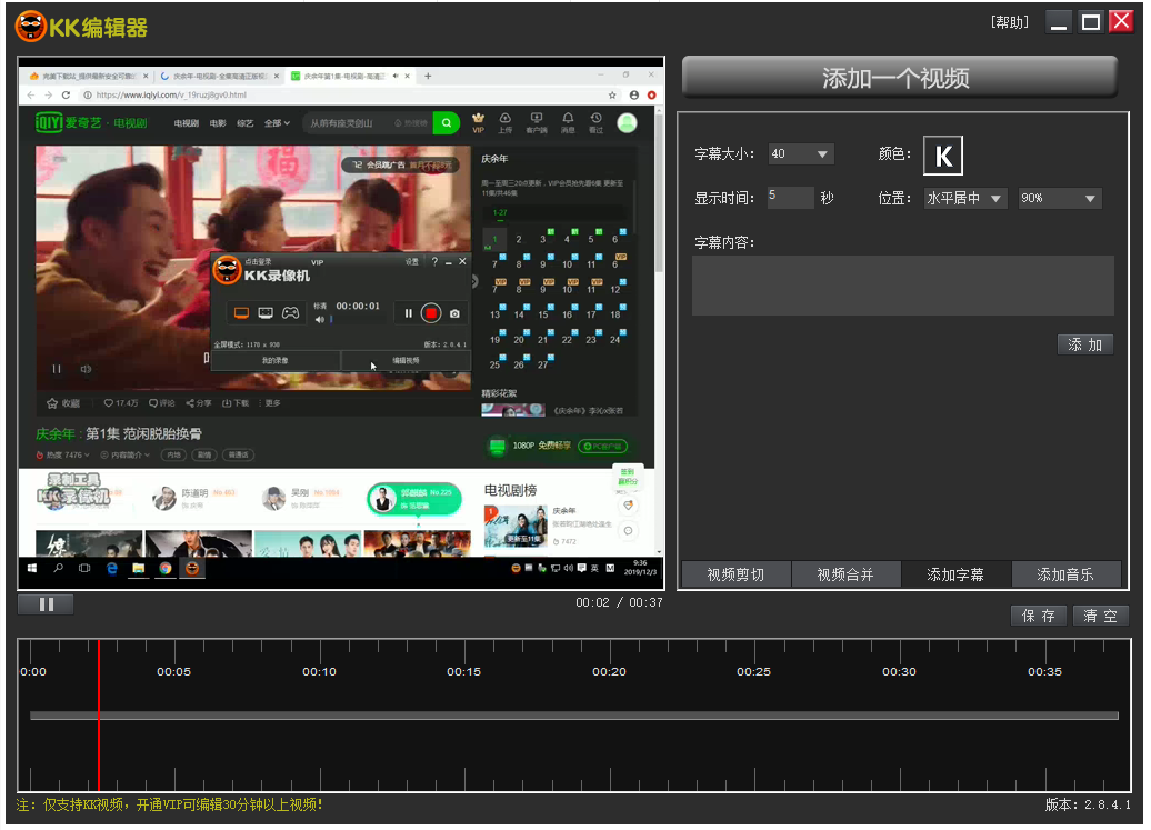 输入字幕内容,设置字幕大小、颜色,选择字幕显示位置、显示时间,点击【添加】,KK录屏视频中已经成功添加了字幕。