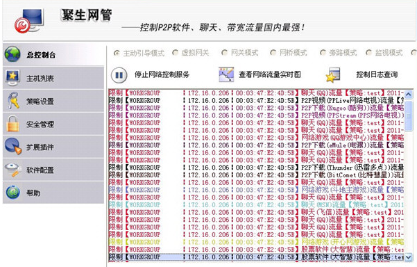 有了聚生网管,即可有效禁止员工在工作时间炒股、网购、看视频、玩网络游戏,还可以限制迅雷、电驴、QQ、MSN、飞信等软件,让你对局域网内所有电脑拥有绝对掌控权。