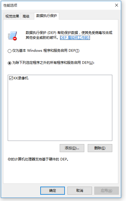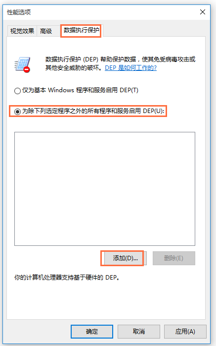 打开性能选项窗口,切换【数据执行保护】选项,勾选【为除下列选定程序之外的所有程序和服务启用DEP(U):】,然后点击【添加】,