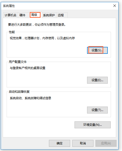 打开系统属性窗口,切换到【高级】选项,点击【性能】——【设置】,