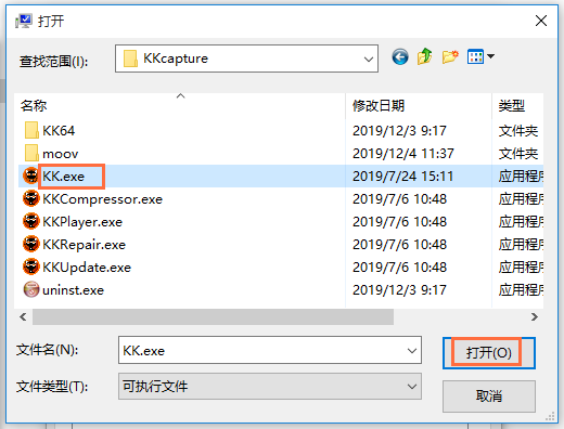 弹出对话框,选择KK录像机安装目录下的KK.exe,点击【打开】,