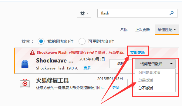 如果不能选择【总是激活】选项,说明Flash插件不是最新版本,点击【立即更新】,更新安装Adobe Flash Player。