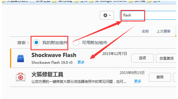 进入附加组件查询页面,勾选【我的附加组件】,找到Flash插件,如果插件很多,你可以在搜索框中输入Flash进行查找,